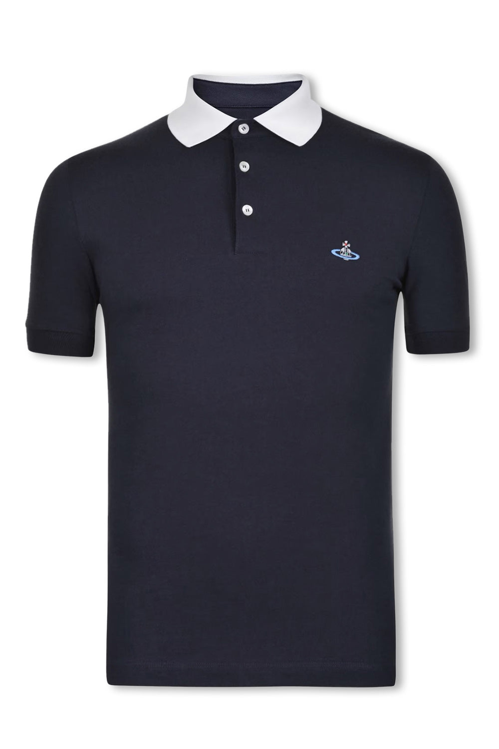Experience timeless elegance with the men's Vivienne Westwood contrasting white collar polo shirt in navy blue. Crafted from a soft cotton composition, this polo shirt offers a slim fit that flatters the silhouette. It features a contrasting fold-down collar, a classic three-button placket, short sleeves, and ribbed cuffs for optimal comfort. The split hemline adds a touch of style and versatility. The iconic Vivienne Westwood orb logo is meticulously embroidered on the left chest, showcasing brand recognition and adding a sophisticated touch. Elevate your casual look with this refined Vivienne Westwood polo shirt, perfect for both formal and relaxed occasions.